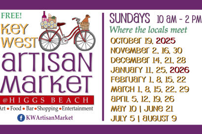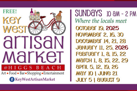 Key West Artisan Market select Sundays in season (November to April) from 10 am to 2 pm at Higgs Beach, in the parking lot at the Key West Wildlife Center. (see the graphic for all the dates). Local artisans include culinary, textile, jewelry, wood, artists & crafters, curiosities,  Local Author’s Nook,  live variety show, fresh produce and lots of great, fresh food. Each week is a different theme focused on island living and local charities. Guests are encouraged to go green and ride bikes. Ample free parking and marked handicapped spots at the park. Please BYOB (bring your own bags).  [MORE]
